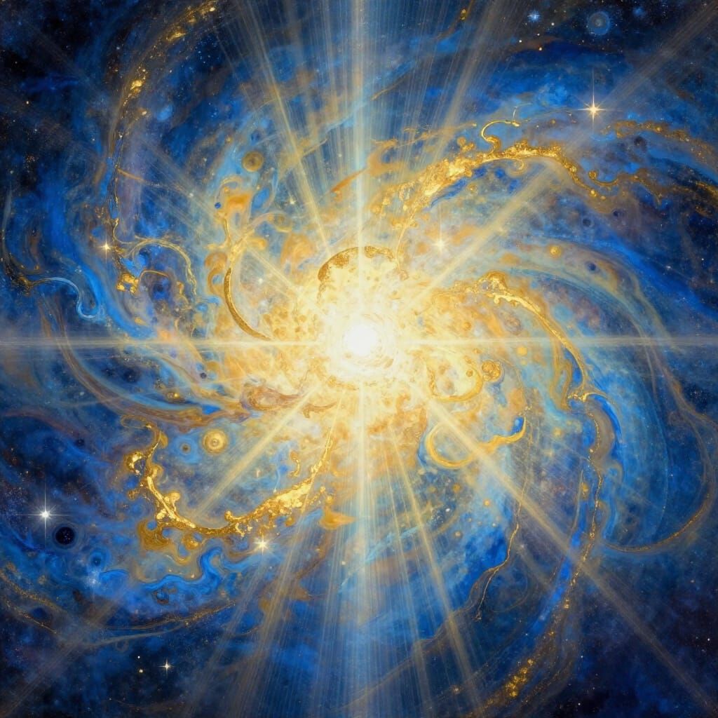 This image showcases abstract celestial art with swirling nebulae in blues and golds, illuminated by divine light. It evokes awe and peace in a visionary art style.