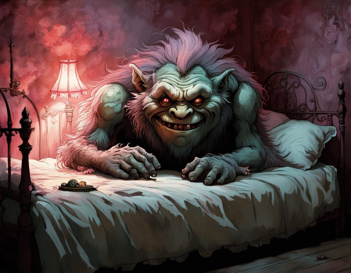 A whimsical illustration of a troll lurking under a bed as a girl sleeps soundly above. The scene evokes storybook fantasy in a Jean-Baptiste Monge style.