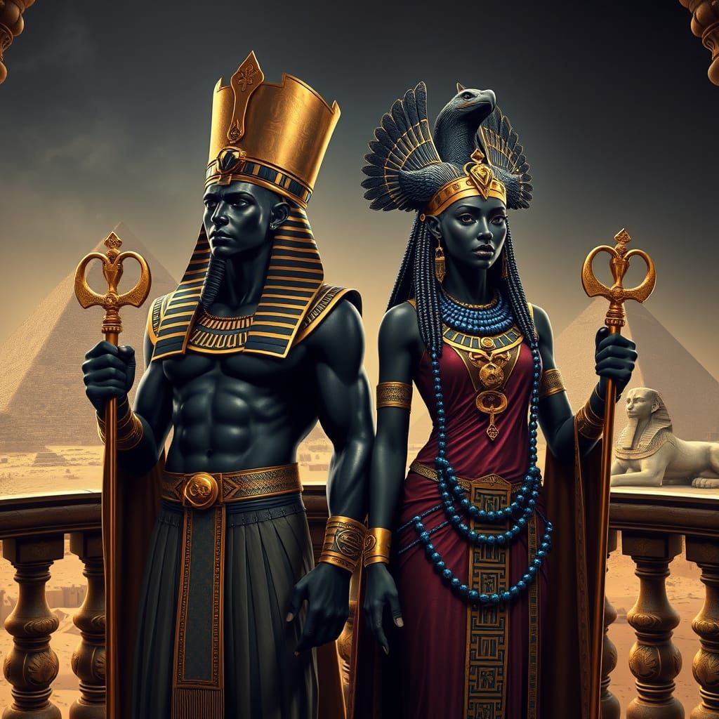 A dramatic image of an ancient Egyptian King and Queen on a balcony. The royal couple wears ornate gold jewelry and traditional garments, with pyramids and the Sphinx visible in the background. Rendered with dramatic lighting.