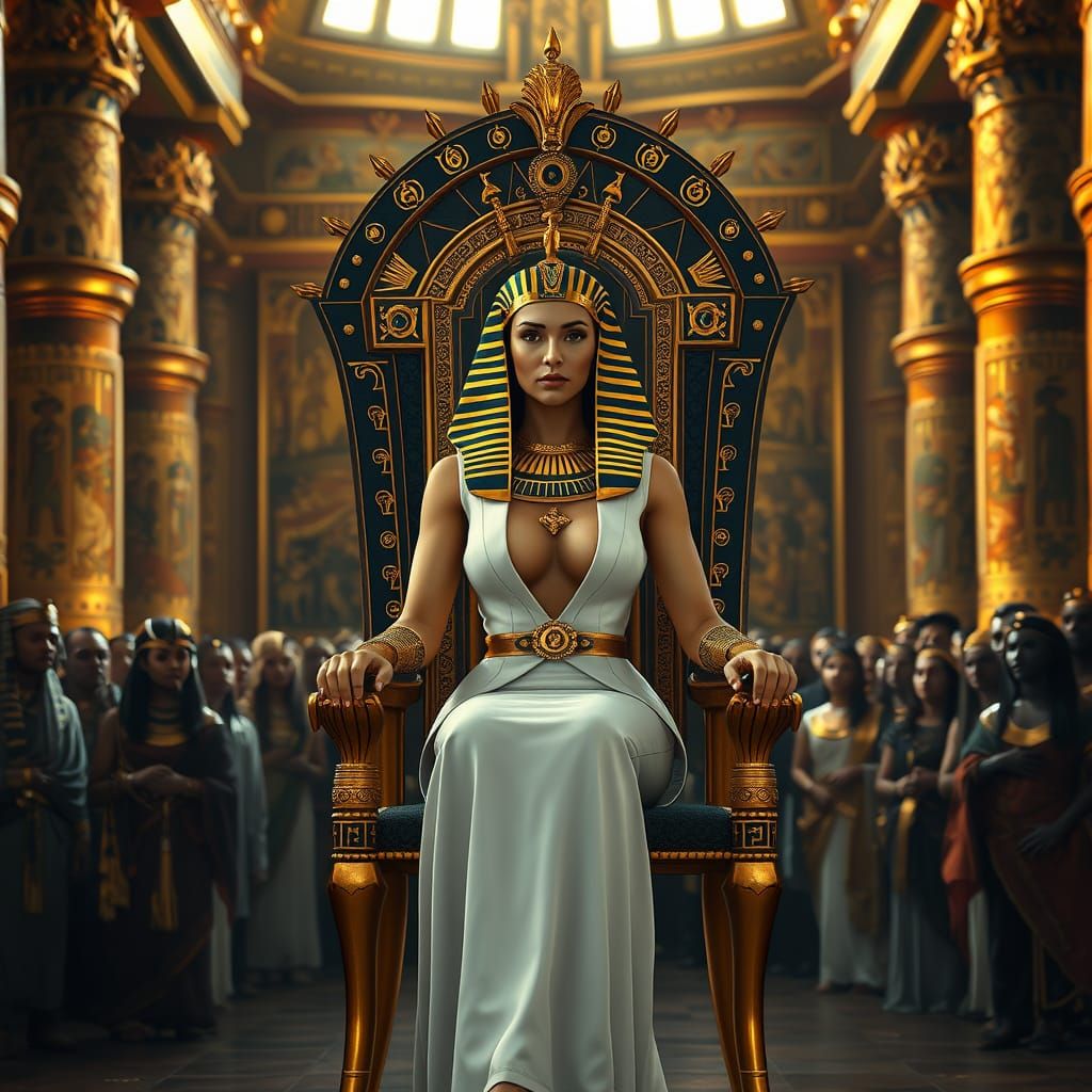 This image features a regal Egyptian princess seated in a richly adorned palace, surrounded by courtiers. Rendered in a deeply saturated matte painting style with dramatic lighting, evoking ancient grandeur.