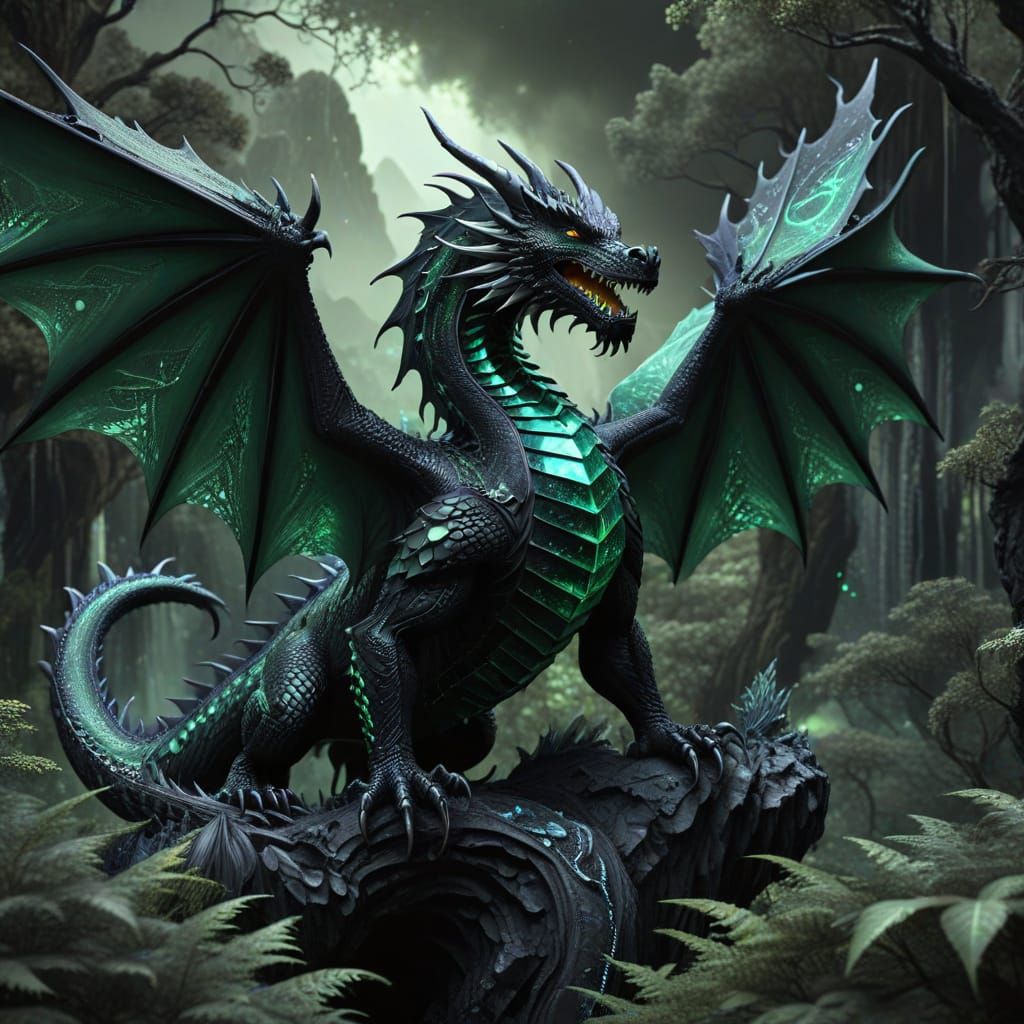 A majestic black dragon soars above a dark forest with a volcano. This image showcases abstract vector fractal art, with crystallized scales and 3D shading.