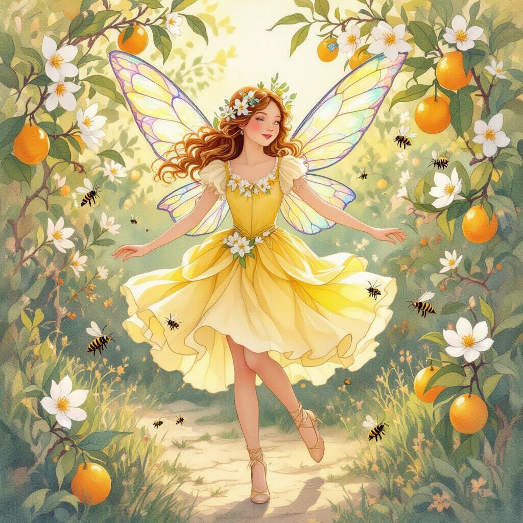 A whimsical citrus fairy with iridescent wings and a dress made of lemon blossoms, dancing in a sun-drenched citrus grove. The air is filled with the sweet scent of orange blossoms and the buzzing of happy bees. The scene is bathed in soft, diffused light, creating a magical and enchanting atmosphere. ...