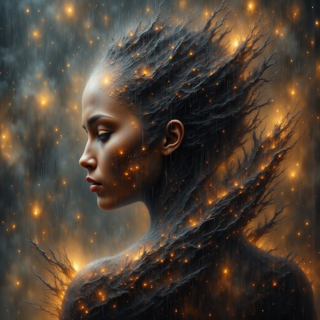 This image depicts a moody, abstract landscape with rain, rendered in a dark oil paint style with smokey grunge and cosmic flux elements. Professional photography techniques enhance the mood.