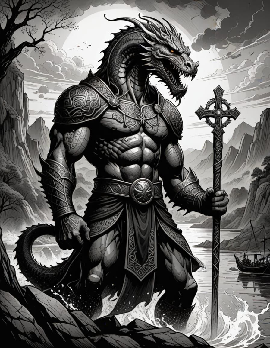 This dynamic black and white comic book illustration depicts St. Patrick standing strong against a giant sea serpent rising from an Irish lake, his cross staff at the ready. Inspired by Celtic knotwork and comic book art, the intricate details and bold lines evoke a sense of drama and tension.