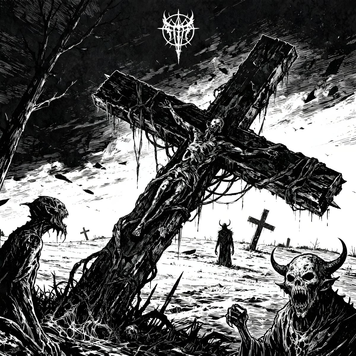 This image features dark, eerie horrors and demonic figures in a hellish landscape. Rendered in a stark, high-contrast black and white style with a gritty aesthetic.