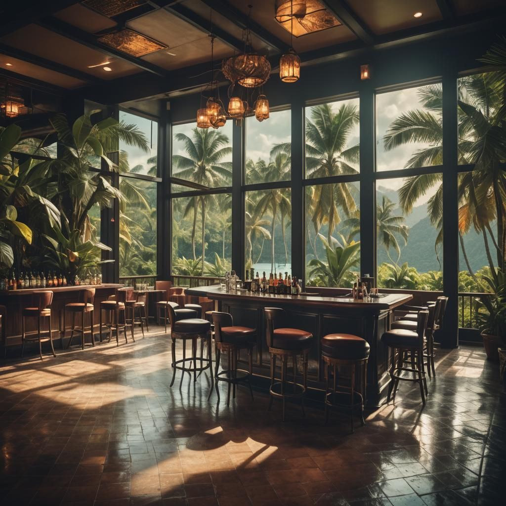 This image shows an elegant bar interior with large windows revealing a vibrant tropical landscape. The scene evokes a cinematic atmosphere with film grain and dramatic lighting.
