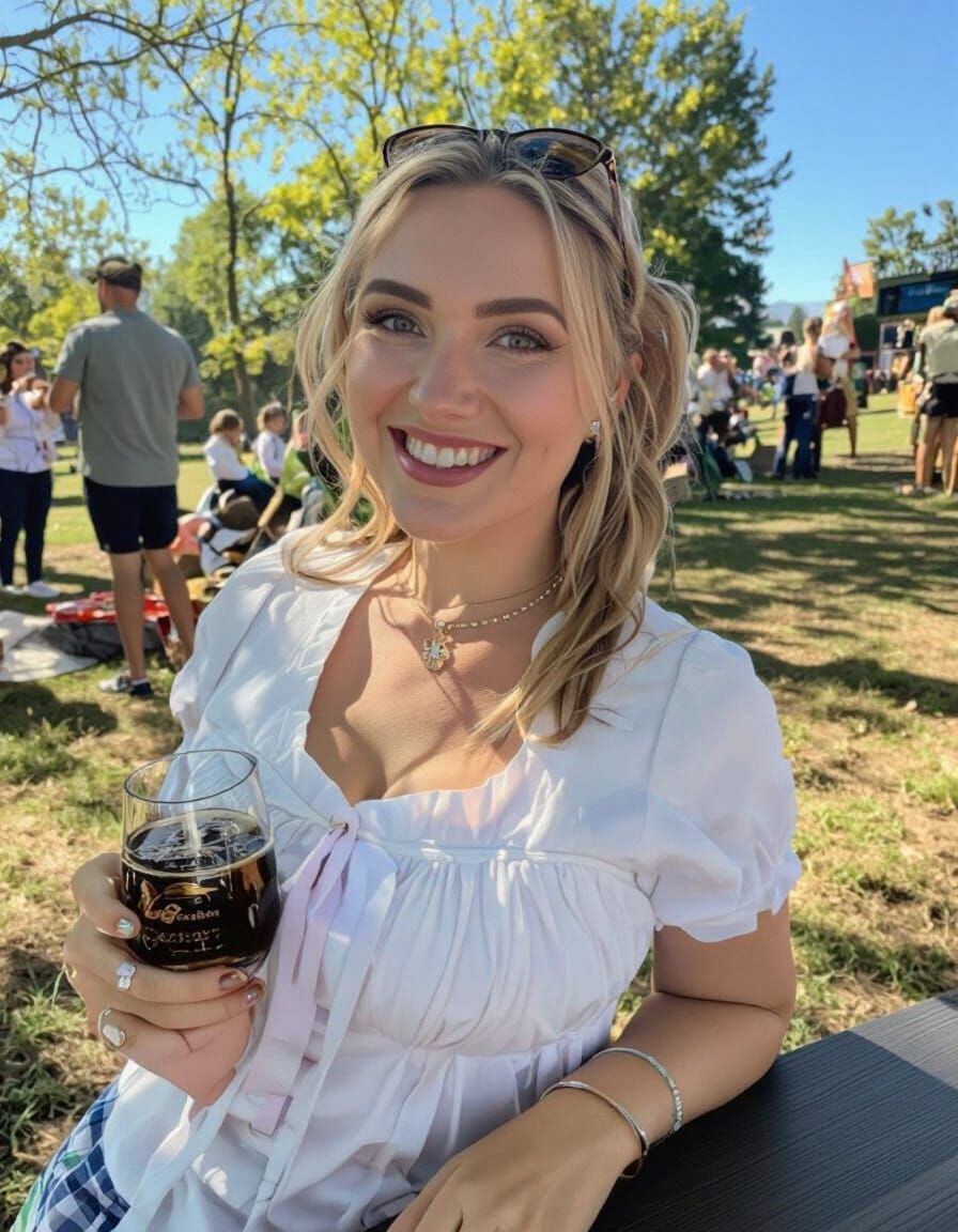 This image shows a woman dressed in a low-cut green dirndl, joyfully celebrating Oktoberfest. The scene captures the festive spirit of the popular German festival.
