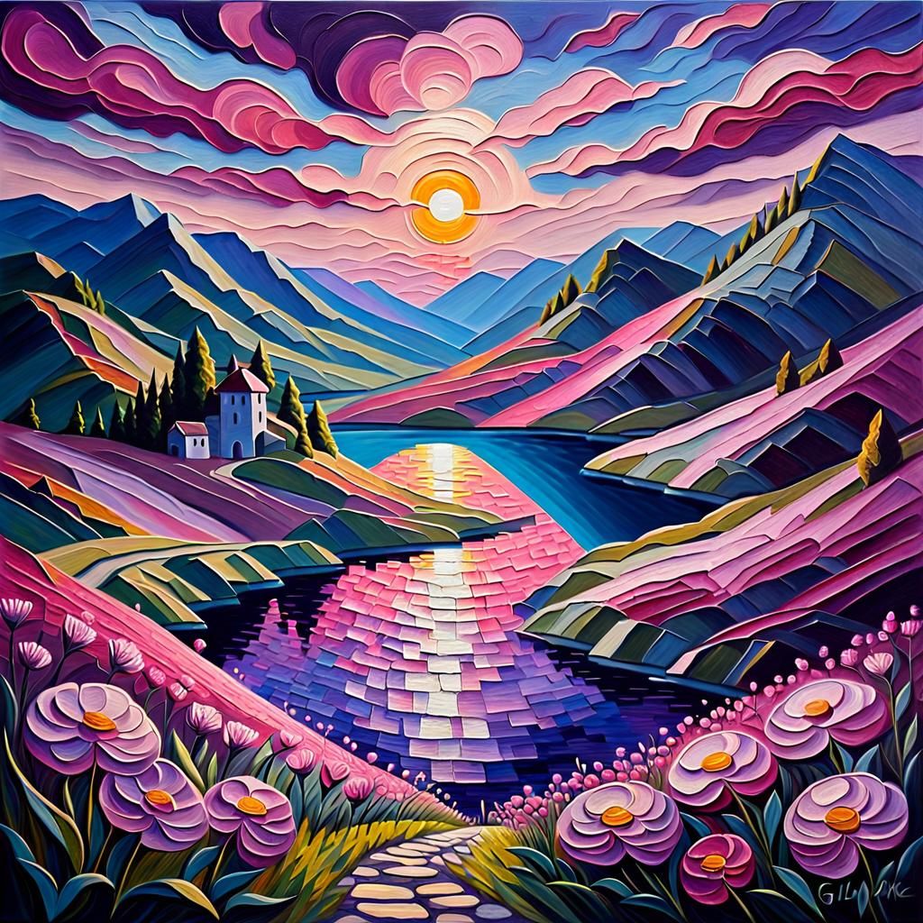 A vibrant oil painting of a sunlit valley filled with pink and purple flowers. The rich impasto technique creates depth, with light and shadow contrasts under a night sky in an Art Nouveau style.