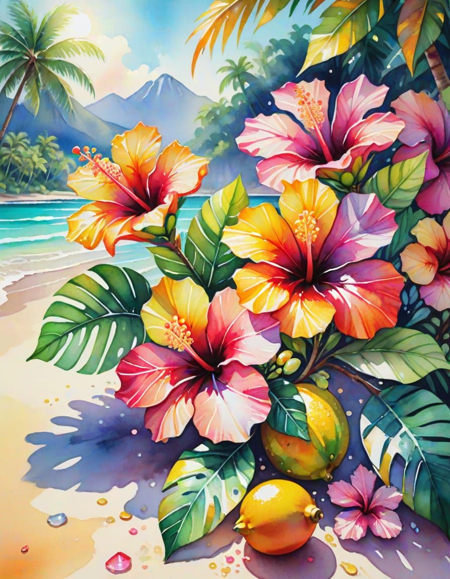 This image shows crystal hibiscus flowers and tropical fruits arranged on a beach. The artwork is rendered in a vibrant, fauvist style, with shimmering petals and soft focus leaves, using a watercolor splash art technique.