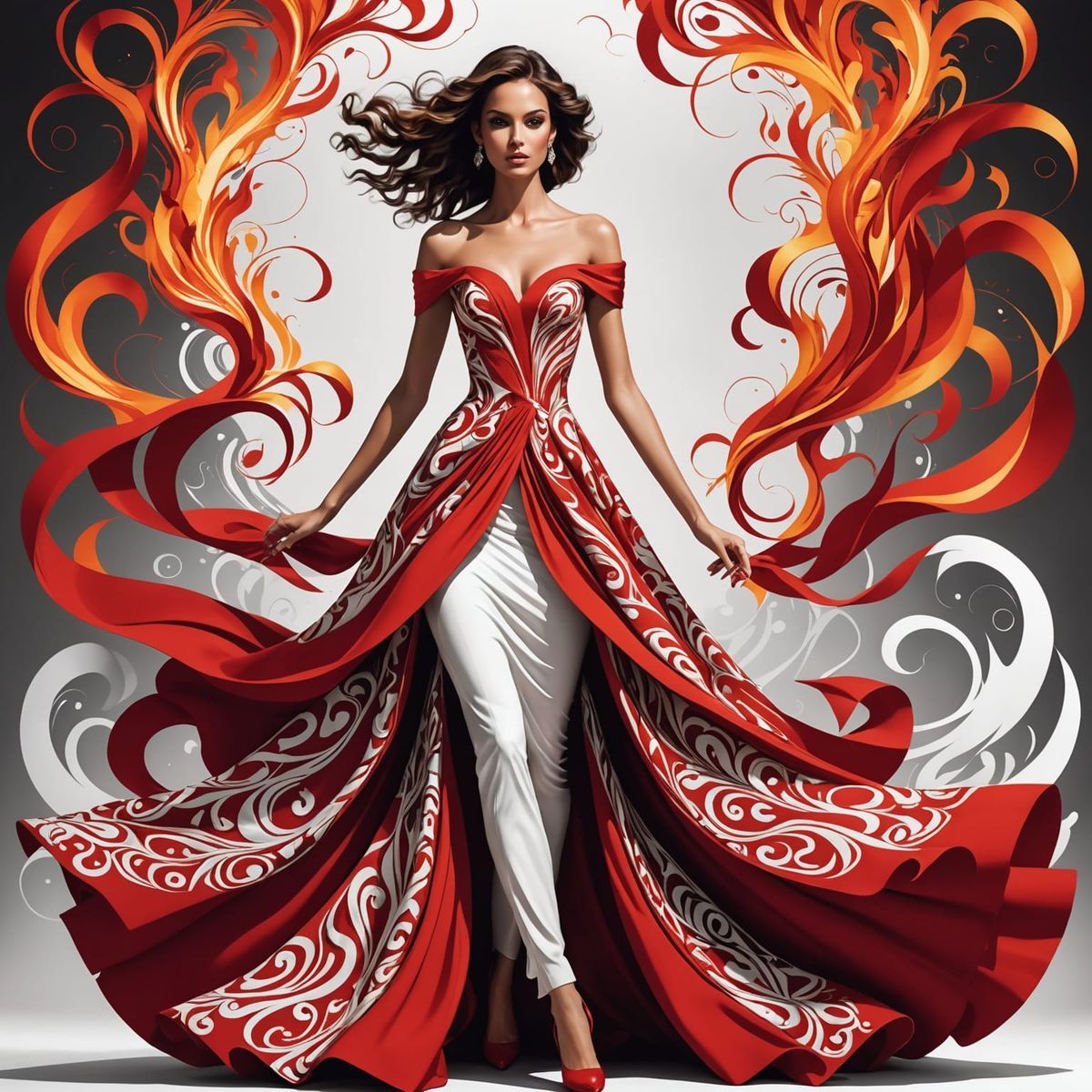 This image shows a fashion model in a flowing red dress. The fabric billows around her, creating a dramatic effect against the stark white background, reminiscent of a high-fashion editorial.