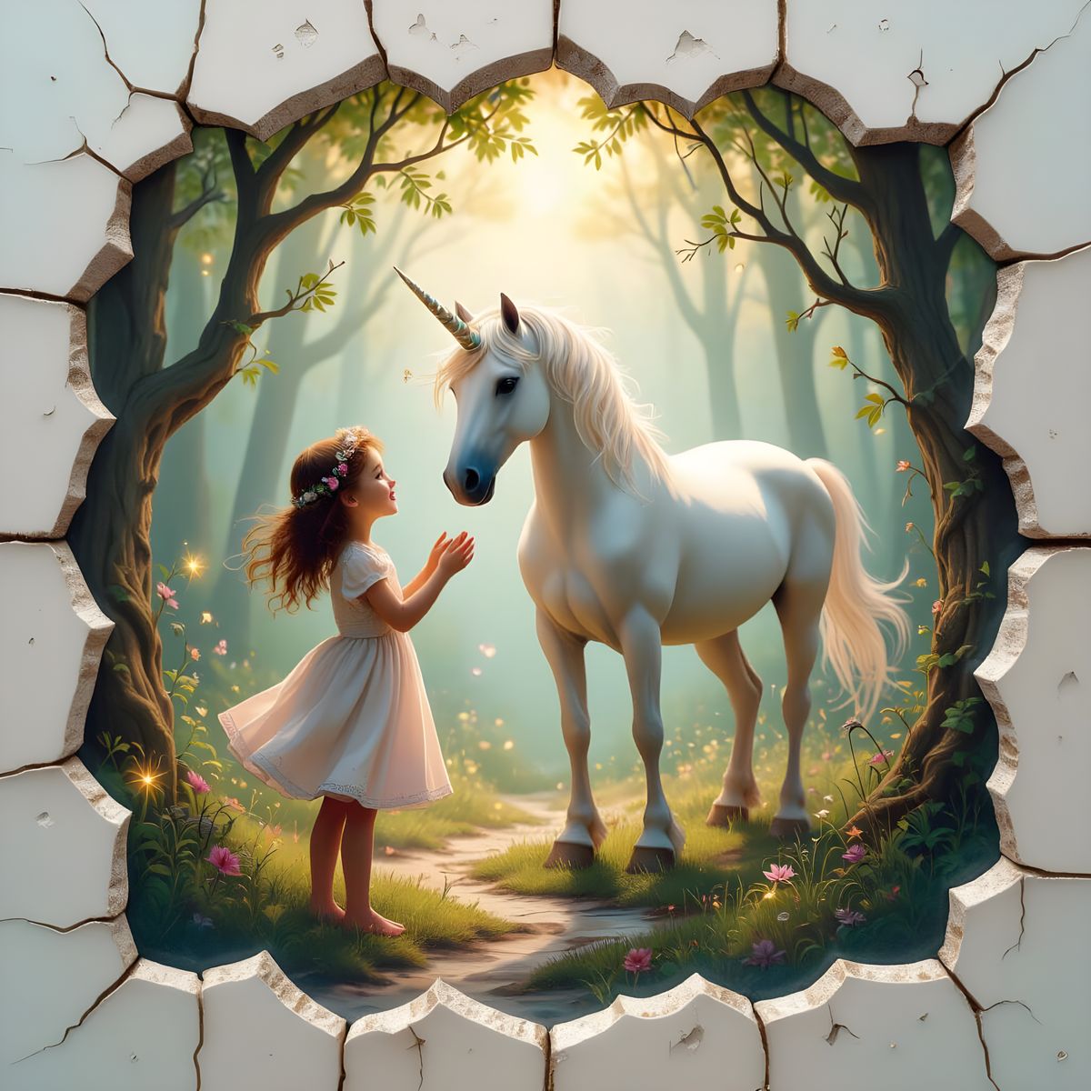 Full Prompt: "A hyper-detailed surreal scene of a joyous girl finding a majestic unicorn in an enchanted forest framed with a softly fractured porcelain surface, where contrasts drift into one another. Warm affection and quiet melancholy blend across the form, expressed through gentle organic growths that gradually transition into textured mineral elements. Delicate glowing vines twist like playful labyrinths beneath translucent cracks. The surface merges ceramic subtle metallic seams, and faint energy glimmers, set within a dreamy surreal space of floating shapes and mild distortions, rendered in luminous vibrant airbrushed colors"