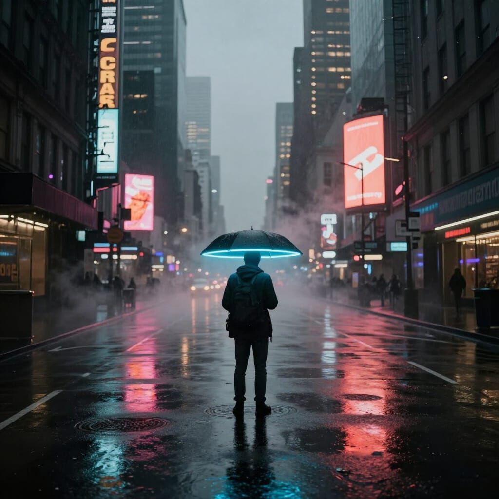 Generate unique rainy cityscapes with glowing neon umbrellas. Free and easy AI image creation.