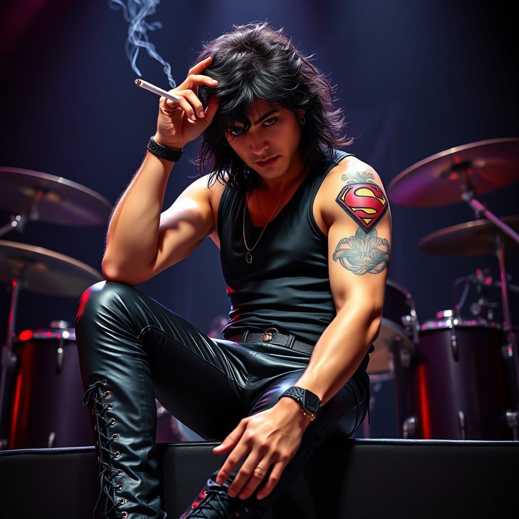This image shows an 80s rock star sitting on a dark bar stage. He is surrounded by black drums and has a Superman tattoo. The image features vibrant colors and dramatic lighting in a retro aesthetic.