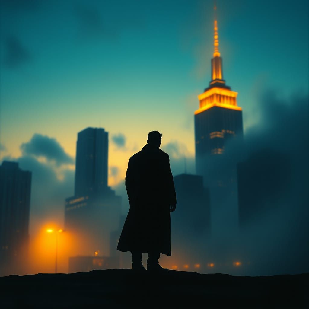 This image shows a solitary figure in a dark coat at dusk. Golden light illuminates misty skyscrapers in the background, rendered with soft brushstrokes and a dark romanticism.