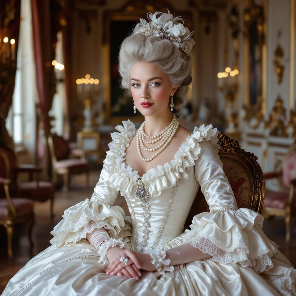 This image shows Madame du Barry in a Baroque-style salon. She wears a silvery white satin gown with lace and pearls, her powdered blonde hair piled high, in a scene of 18th-century French opulence.