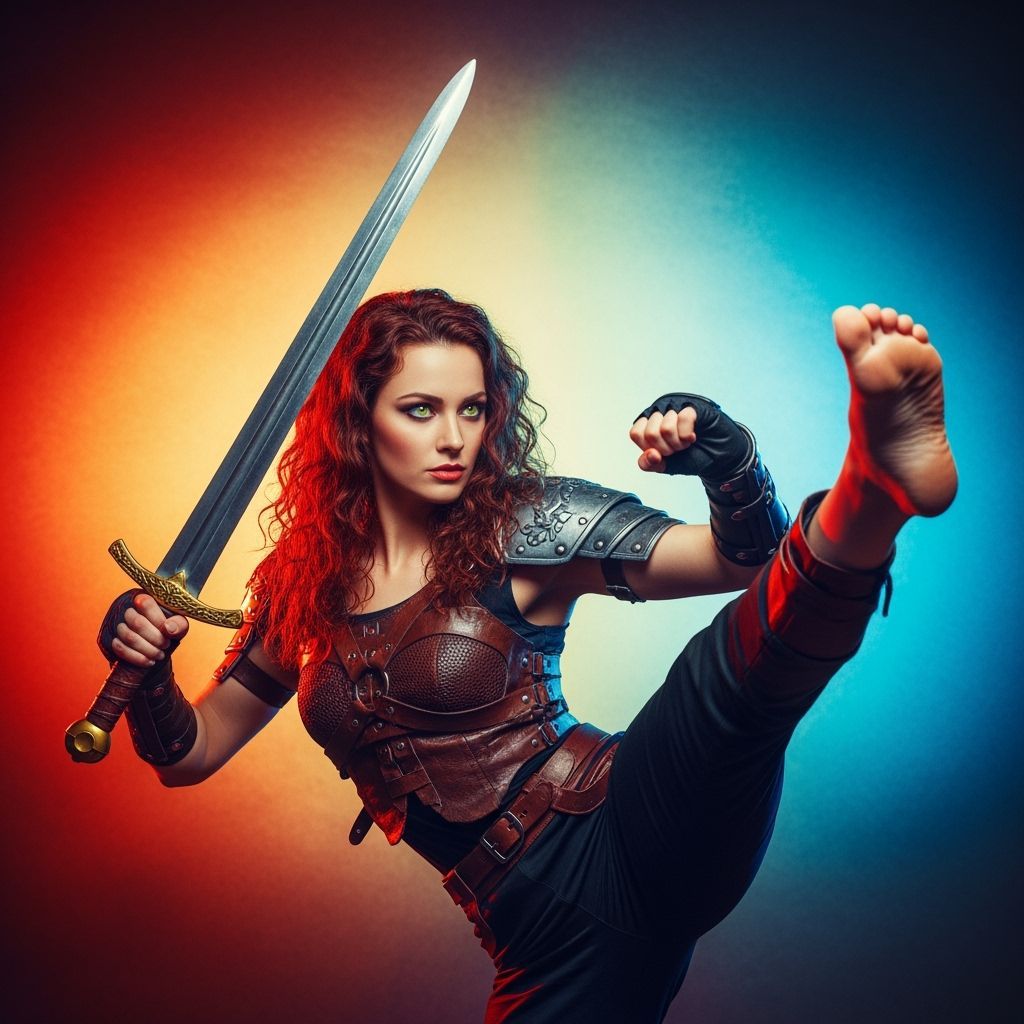 This image shows a red-haired woman in leather armor delivering a karate kick with a sword. It's a hyperrealistic portrait with vibrant colors and dramatic lighting, in a cinematic style.