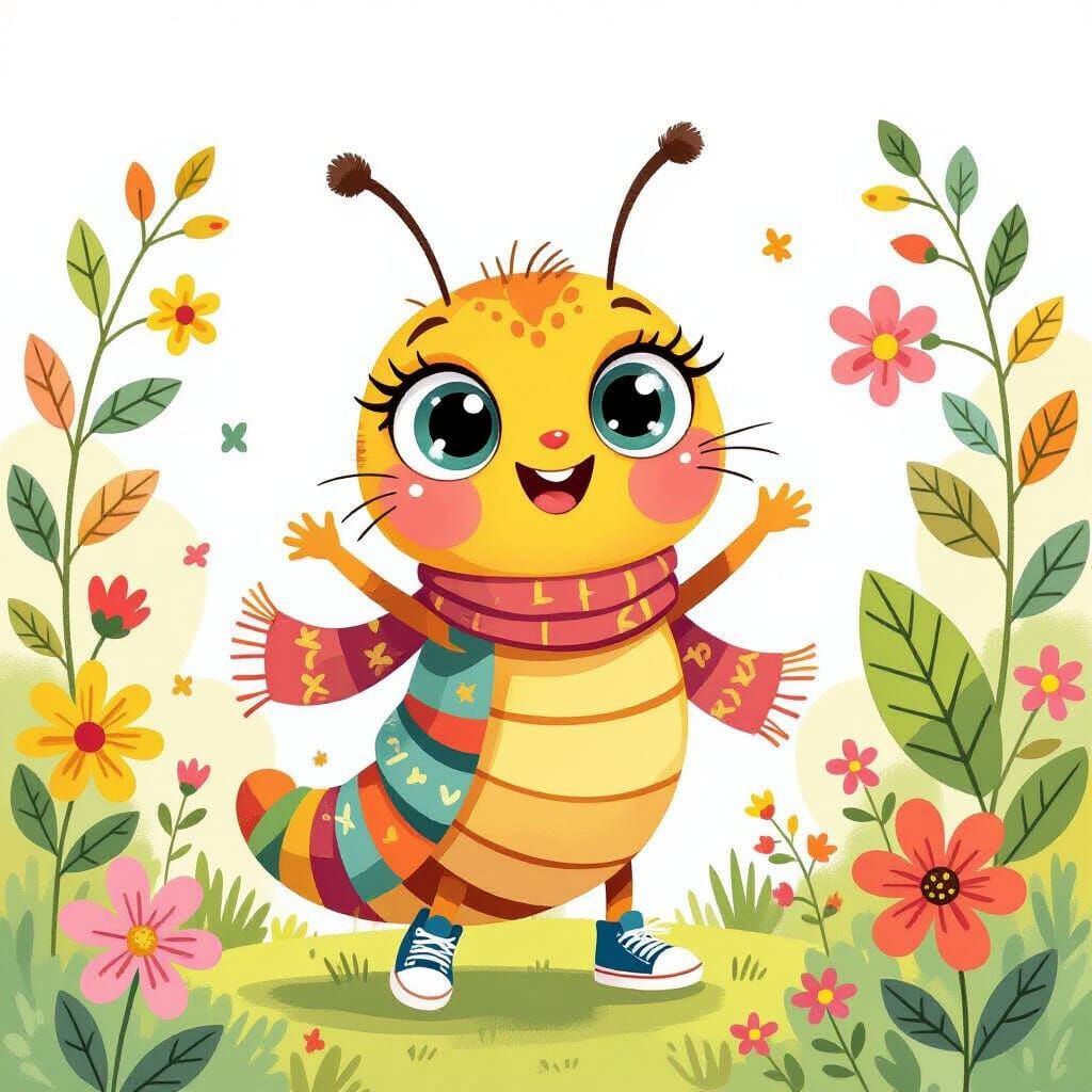 A cheerful cartoon of an excited caterpillar with sneakers and a scarf amidst colorful flowers. The style is reminiscent of soft watercolor illustrations with intricate details.