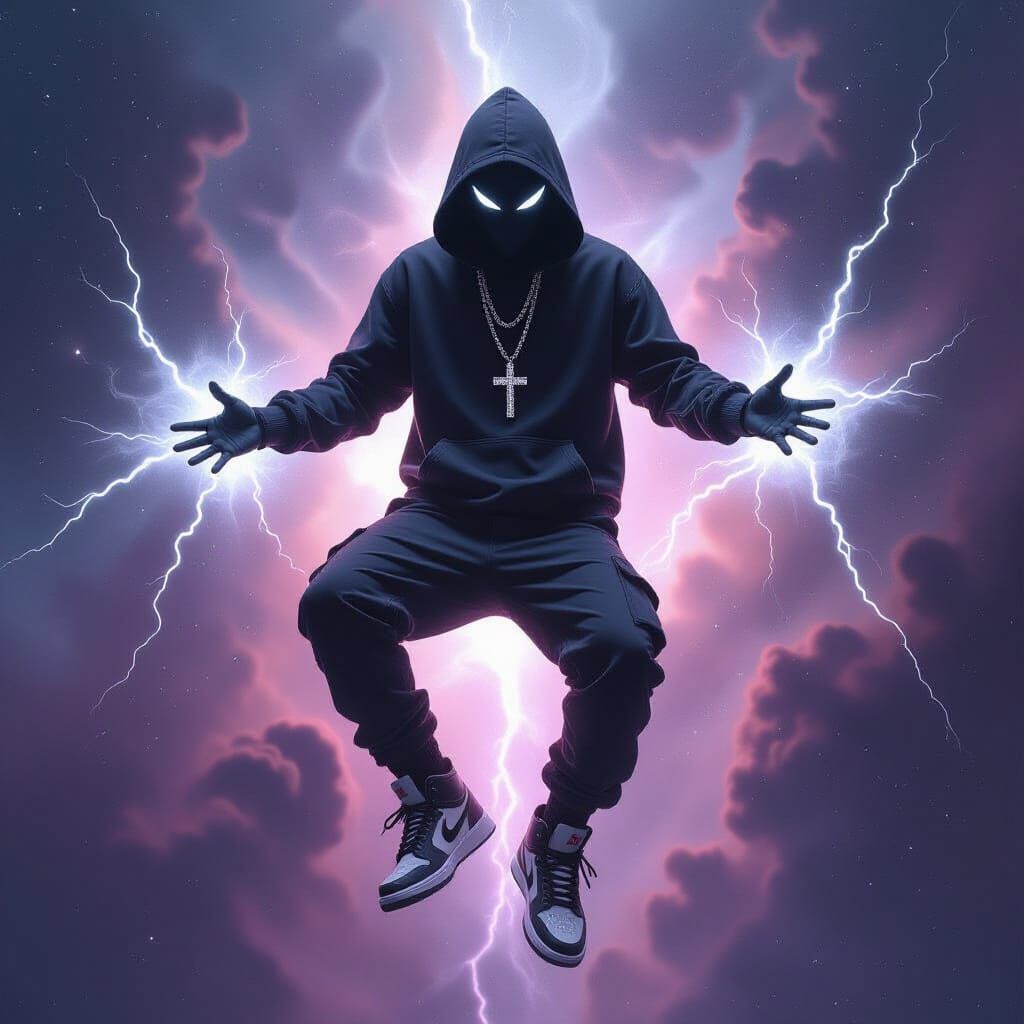 A cosmic entity levitates in a nebula wearing a hoodie and Jordans. The entity's hands emit white-hot energy against a swirling interstellar background in cosmic horror style.