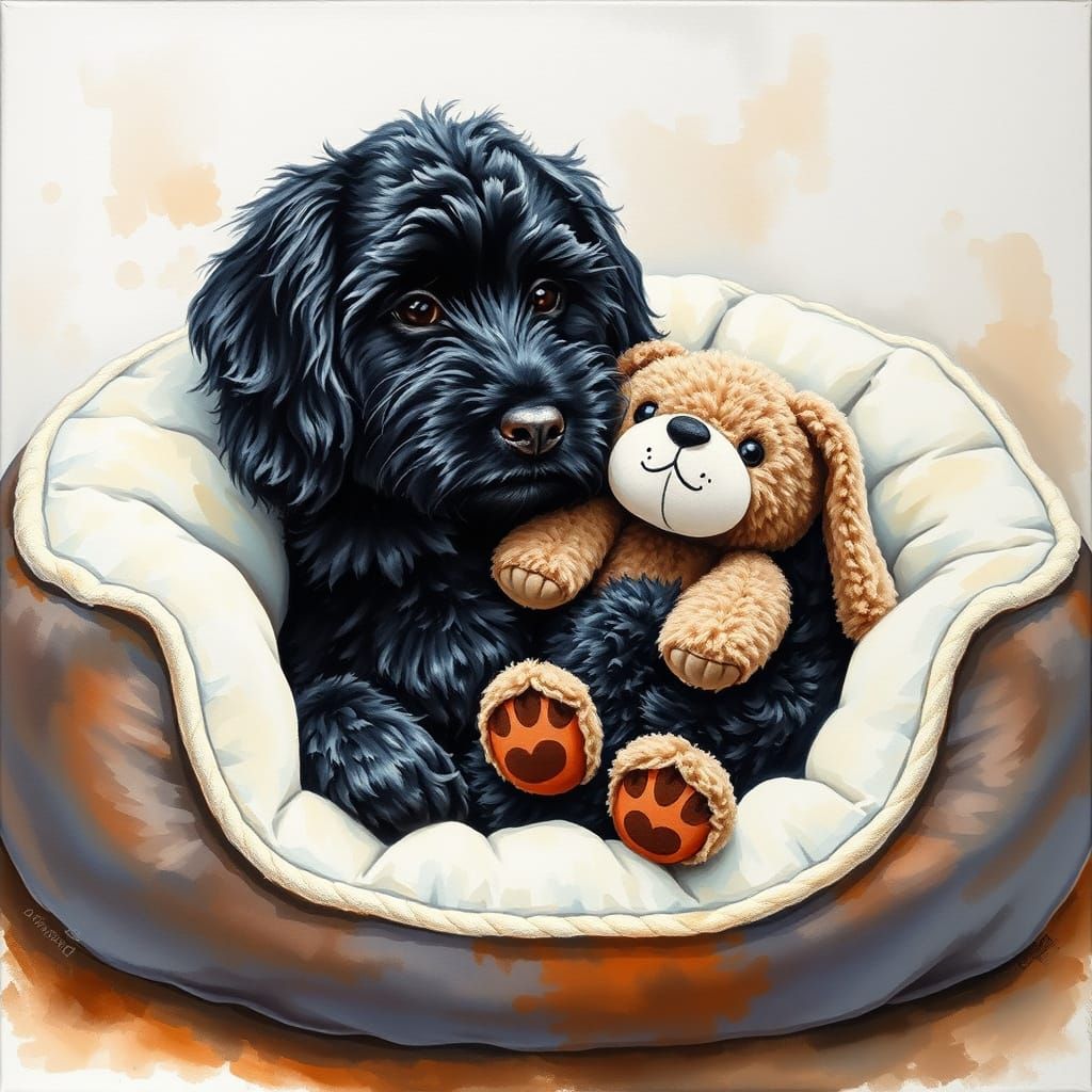 This image shows a black Holland Lop rabbit cuddling a stuffed toy on a dog bed. Rendered in a thick, textured gouache and watercolor style with visible brush strokes.
