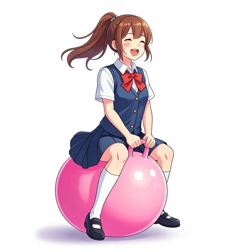 This image shows Haru Yoshioka, a cheerful 17-year-old schoolgirl with brown hair in a ponytail, bouncing on a pink hopper ball. The vibrant scene is reminiscent of Ghibli animation with soft watercolor textures.