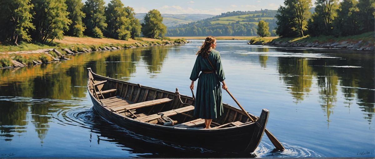 A hyperrealistic acrylic painting of a beautiful woman prepared for a mythical crossing. The artwork blends abstract elements with thick, impasto textures, creating a captivating scene.