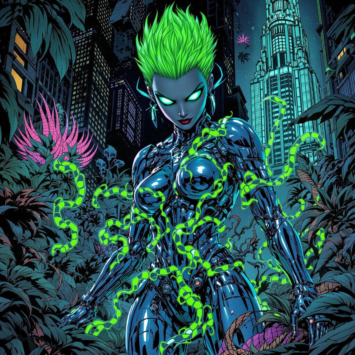 A chrome huntress with neon green hair and electric blue eyes emerges from a futuristic jungle. The image blends industrial futurism with bioluminescent details, creating a fantasy realism aesthetic.