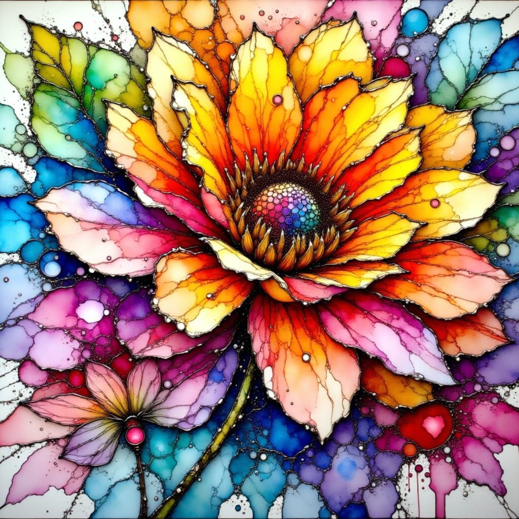 A vibrant image showing a zinnia flower with rainbow-colored petals and distinct outlines. The artwork is reminiscent of stained glass with an alcohol ink splash effect.