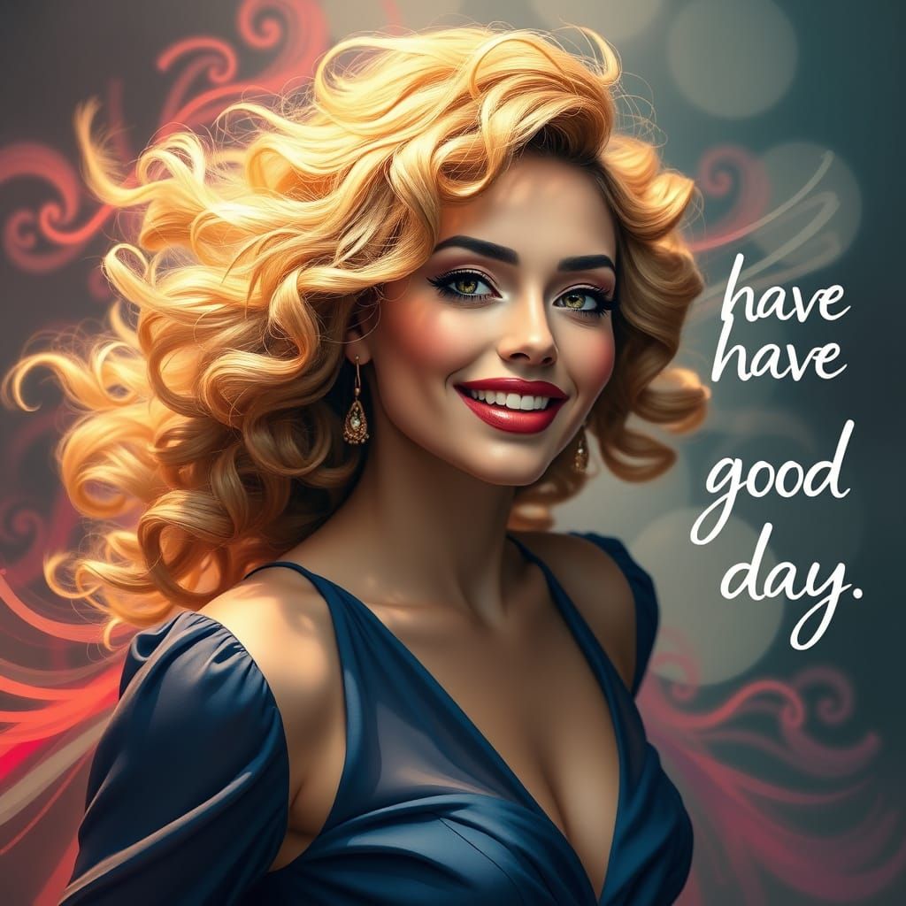 This image shows a beautiful woman with curly light-brown hair and glamorous makeup, wearing elegant attire. The artwork features dynamic movement and joyful colors in a hyper-realistic, 3D rendered style.