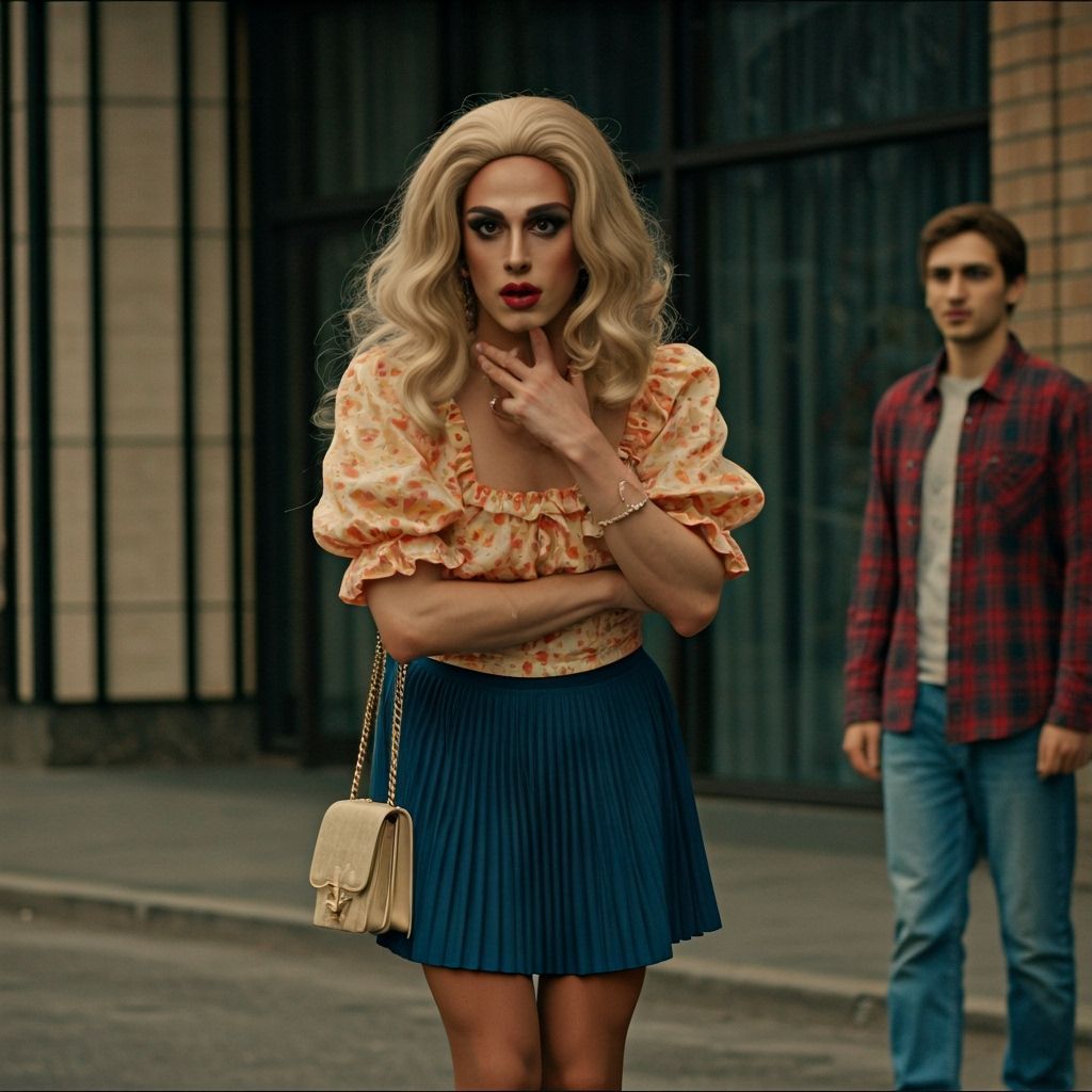 This cinematic film still captures a worried 19-year-old man in a blonde wig, mini skirt, and heels, being observed by a girl and her boyfriend. Shot with atmospheric, dramatic lighting and film grain.