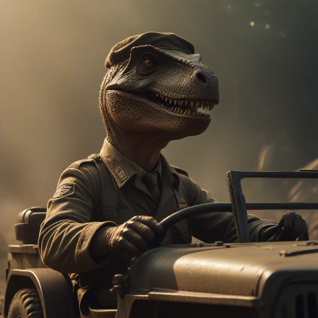 Easily generate unique images of dinosaurs in military uniforms driving WWII jeeps with our free AI tool.
