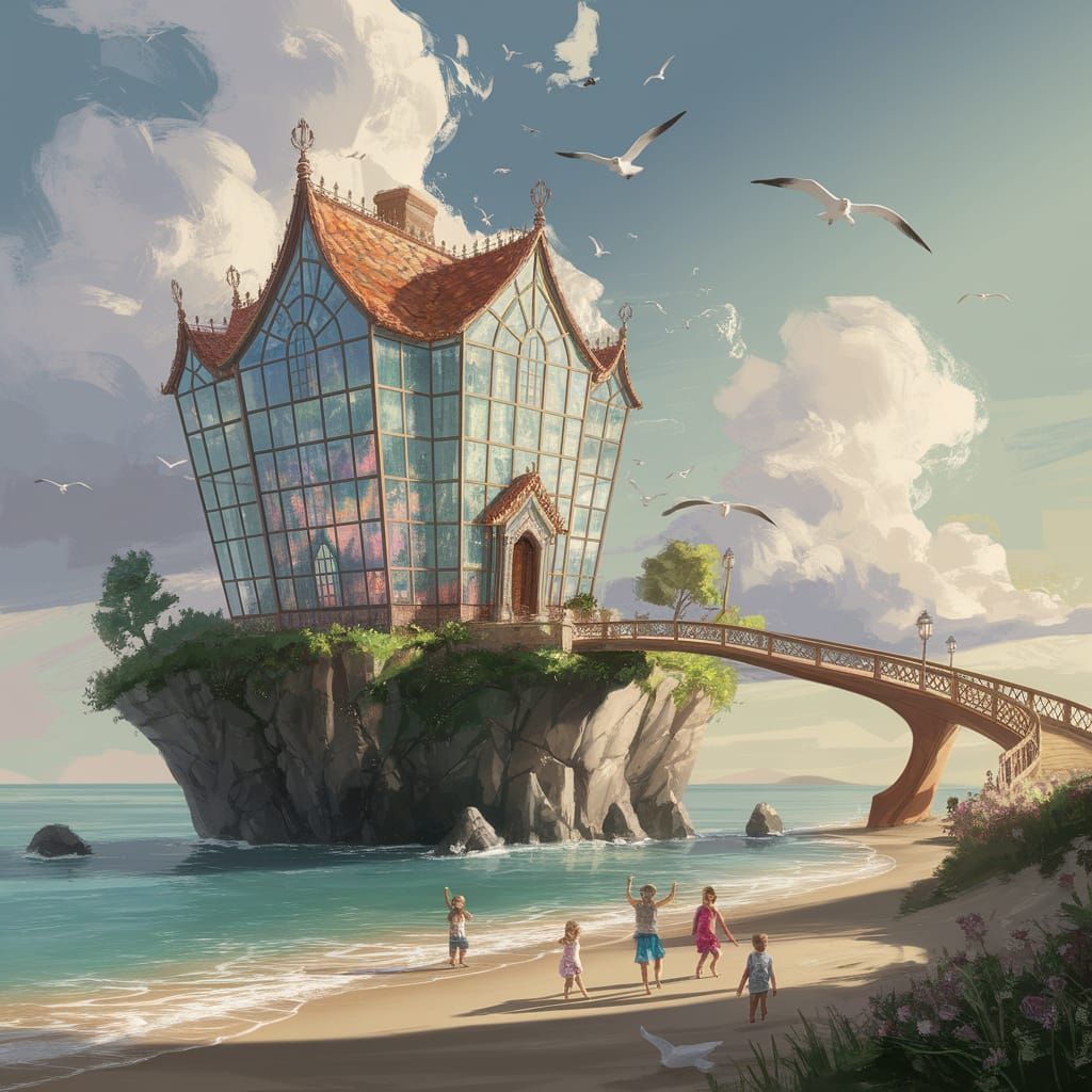 This enchanting image depicts a glass house perched atop a cliff, overlooking a peaceful sea. A winding bridge connects the house to a sandy beach, where children play and seagulls soar. Rendered in a blend of impressionist and fantasy art, the scene is bathed in soft sunlight and vibrant colors.