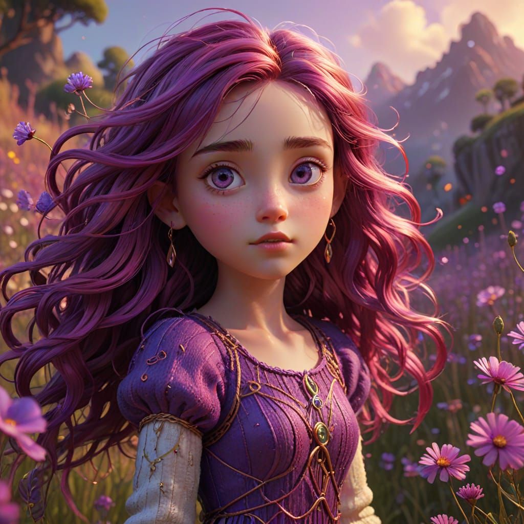 This image shows a little girl with violet eyes and amethyst hair dancing in a meadow. The 3D modeled digital art features vibrant, 18k gold accents and bright colors, with a surreal, dreamlike aesthetic.