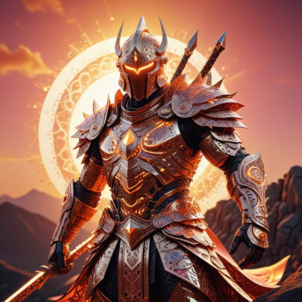 A striking picture of an armored warrior atop a hill, silhouetted against a fiery sunset. This image features vibrant fractal patterns and geometric shapes in a Zentangle art style.