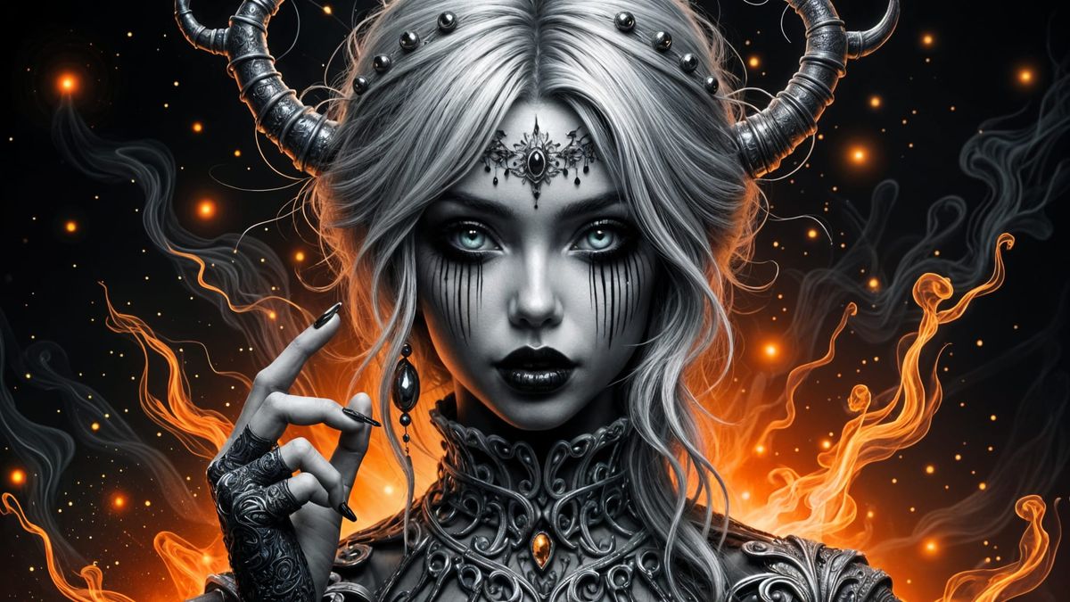 This image shows a silver-haired queen with piercing eyes and a chilling smile, surrounded by a dark aura. Her gown features intricate, shadowy motifs and floating constellation maps in a digital art style.