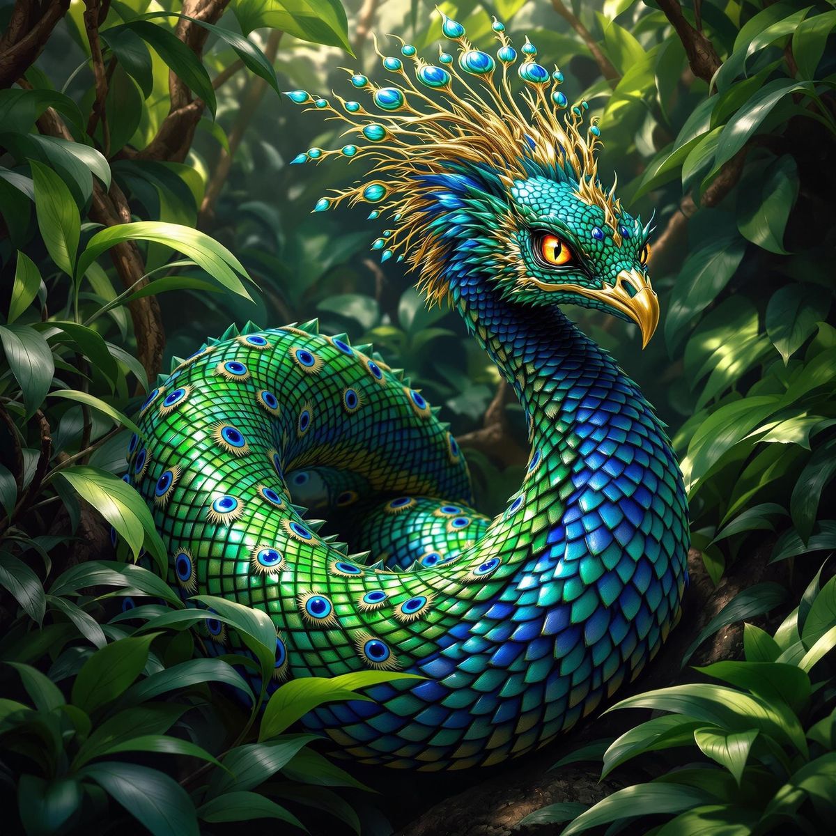 A vibrant image of Mboi Tui, a serpent-peacock hybrid, in a lush rainforest. The creature's emerald and sapphire plumage is rendered with biomechanical intricacy and ornate naturalism.