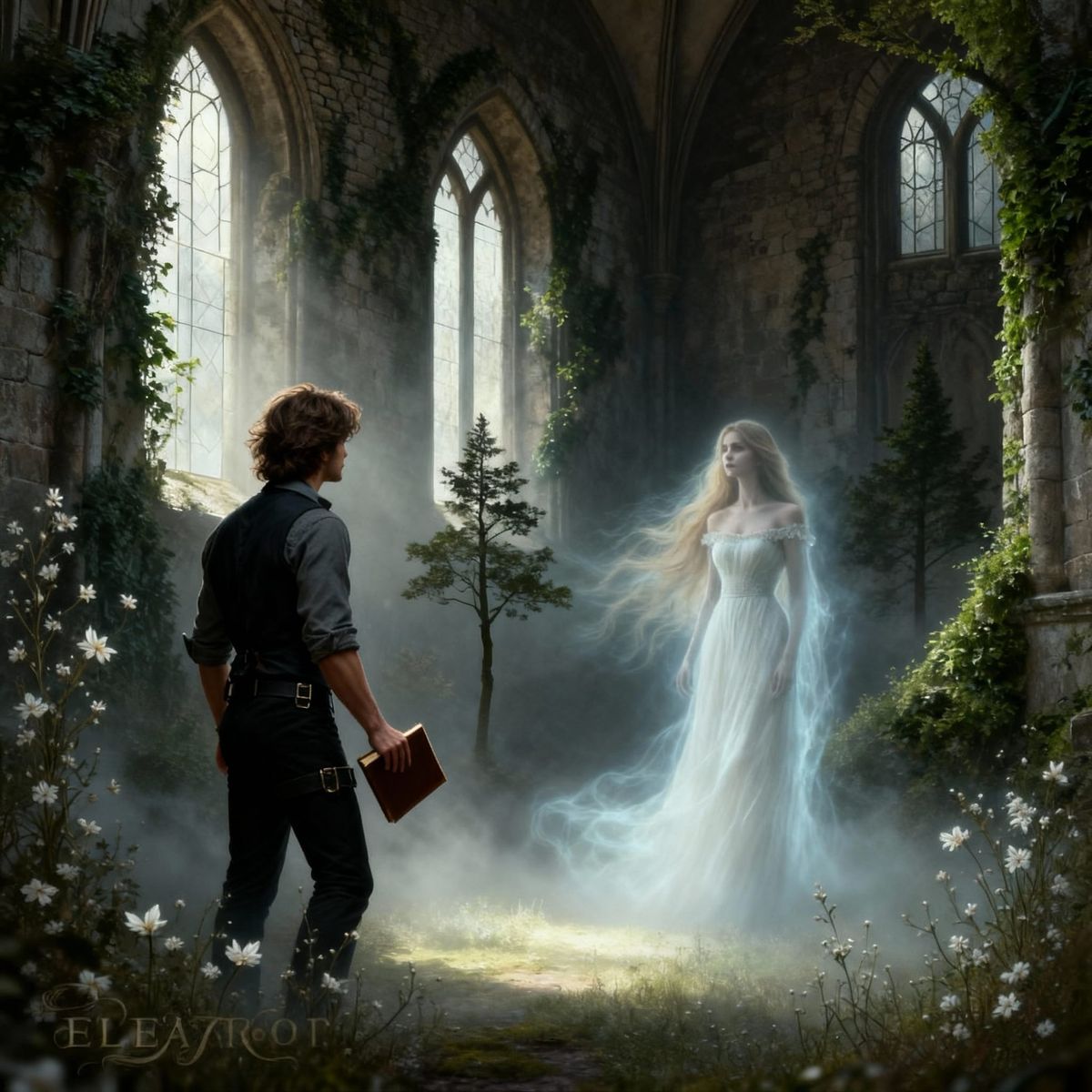 This image depicts a ghostly apparition in a lonely woodland setting near an old chapel, as an artist investigates the supernatural presence.