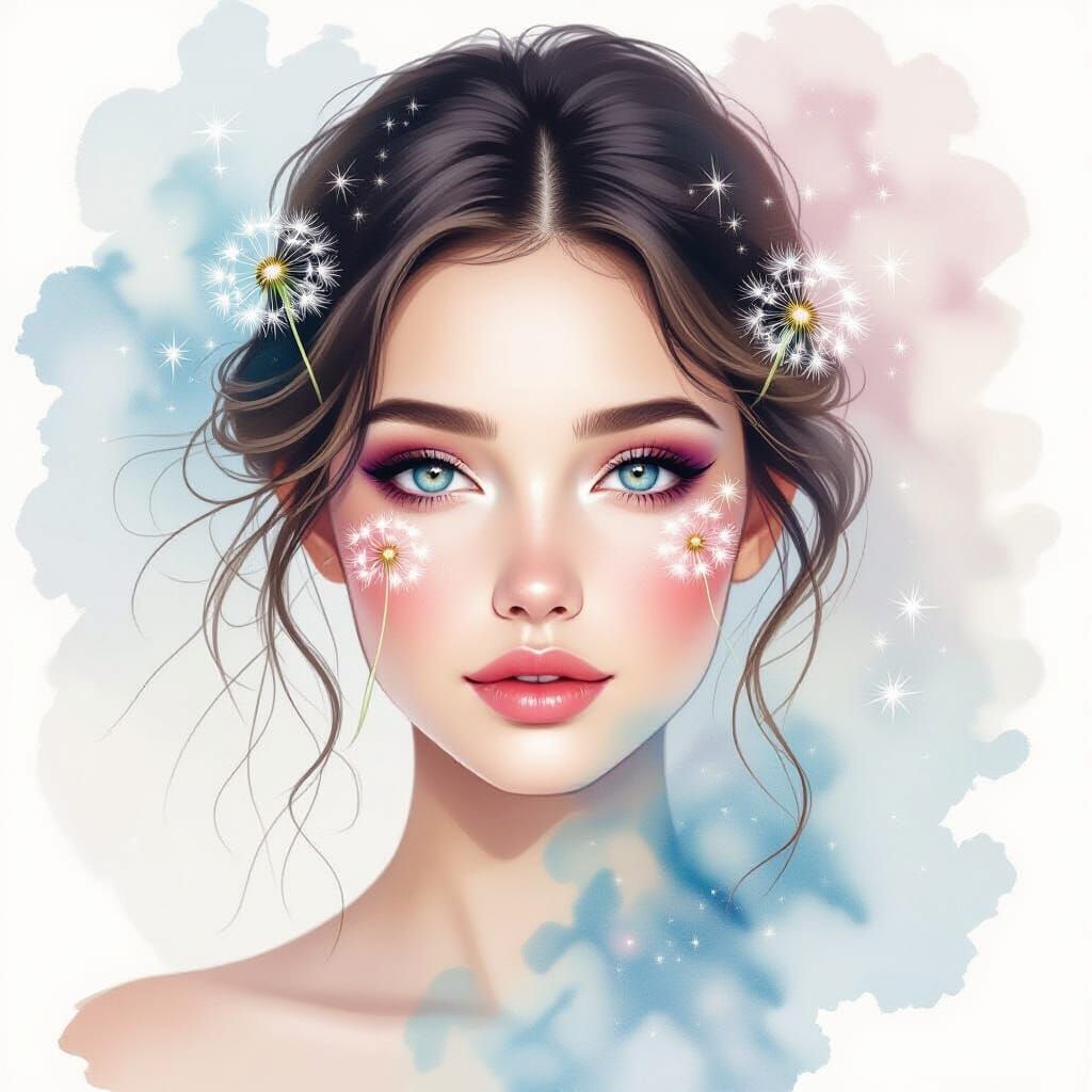 This image shows a surreal portrait of a woman with dandelions on her face and eyes reflecting cosmic nebulae. The artwork blends celestial and earthly elements with smooth gradients in an ethereal style.
