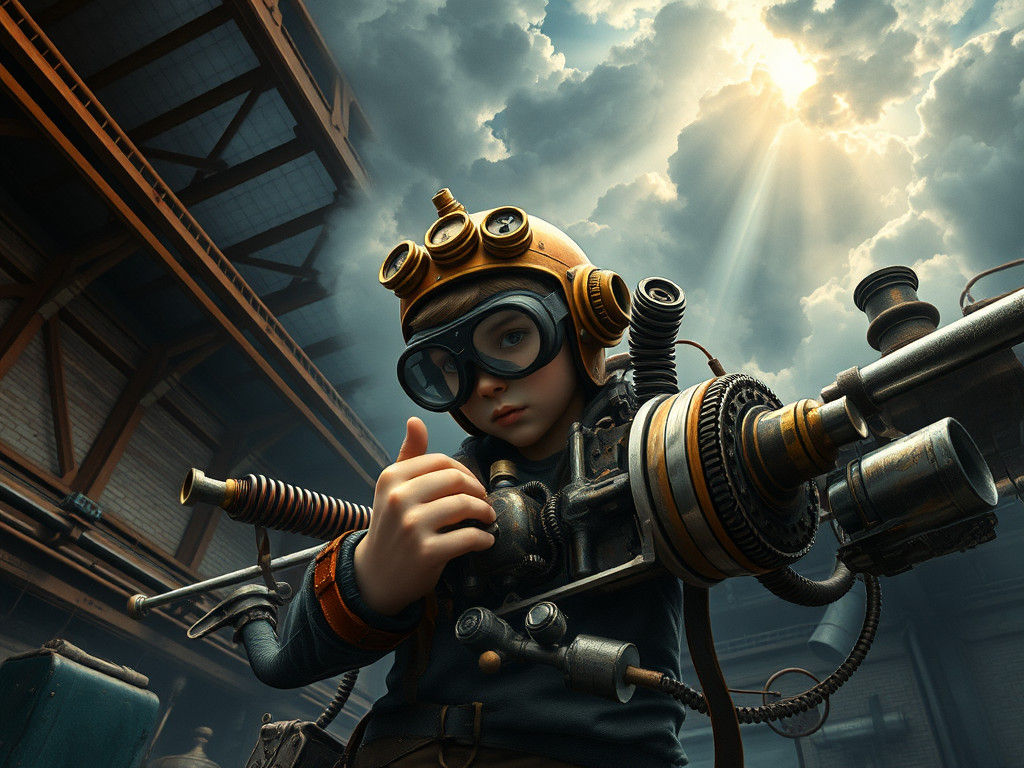This image shows a young boy in a copper steampunk helmet meticulously repairing a steam-powered flying vehicle. The scene is set in a dimly lit industrial complex with a dramatic sky, rendered as pastel watercolor art.