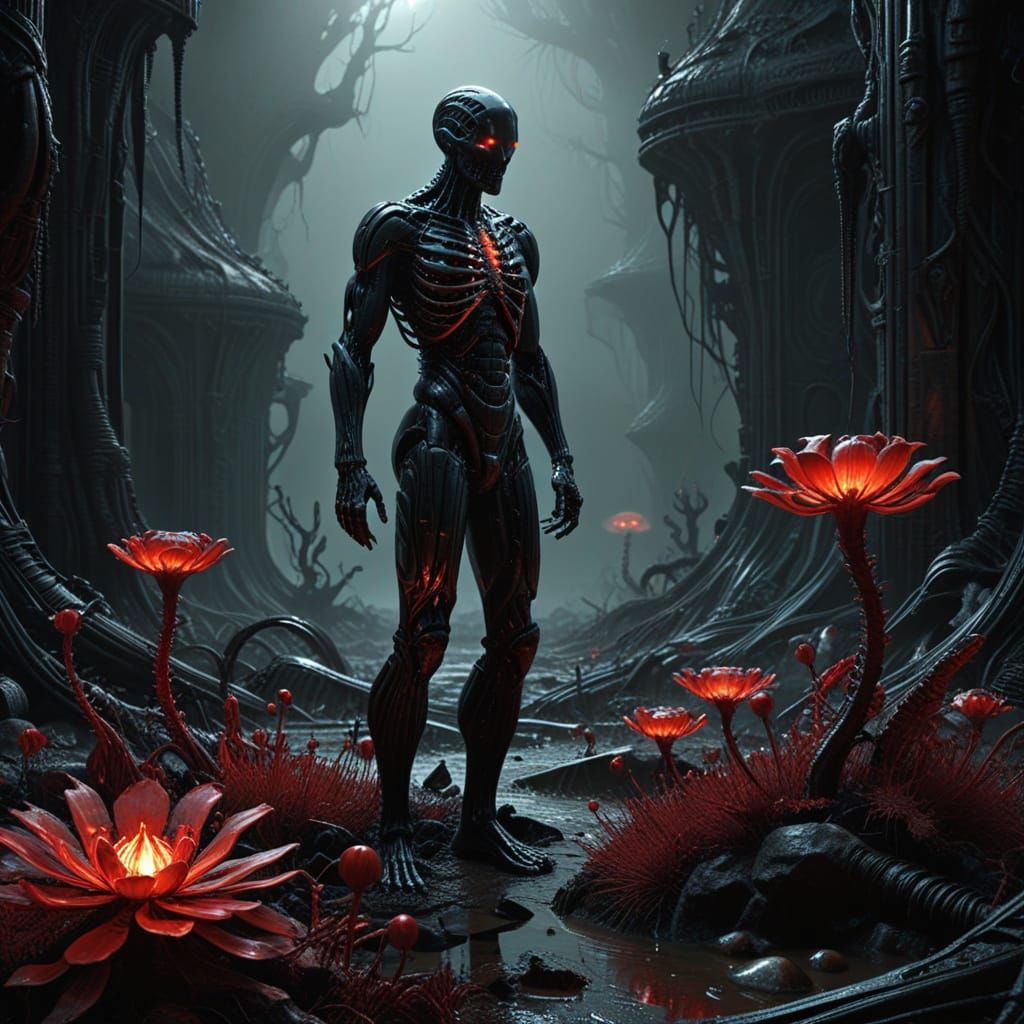 This 3D rendered image shows a solitary figure in a barren, atmospheric landscape. Eerie bioluminescent plants and abstract shapes create a surreal, unsettling mood with a monochromatic palette and crimson highlights.