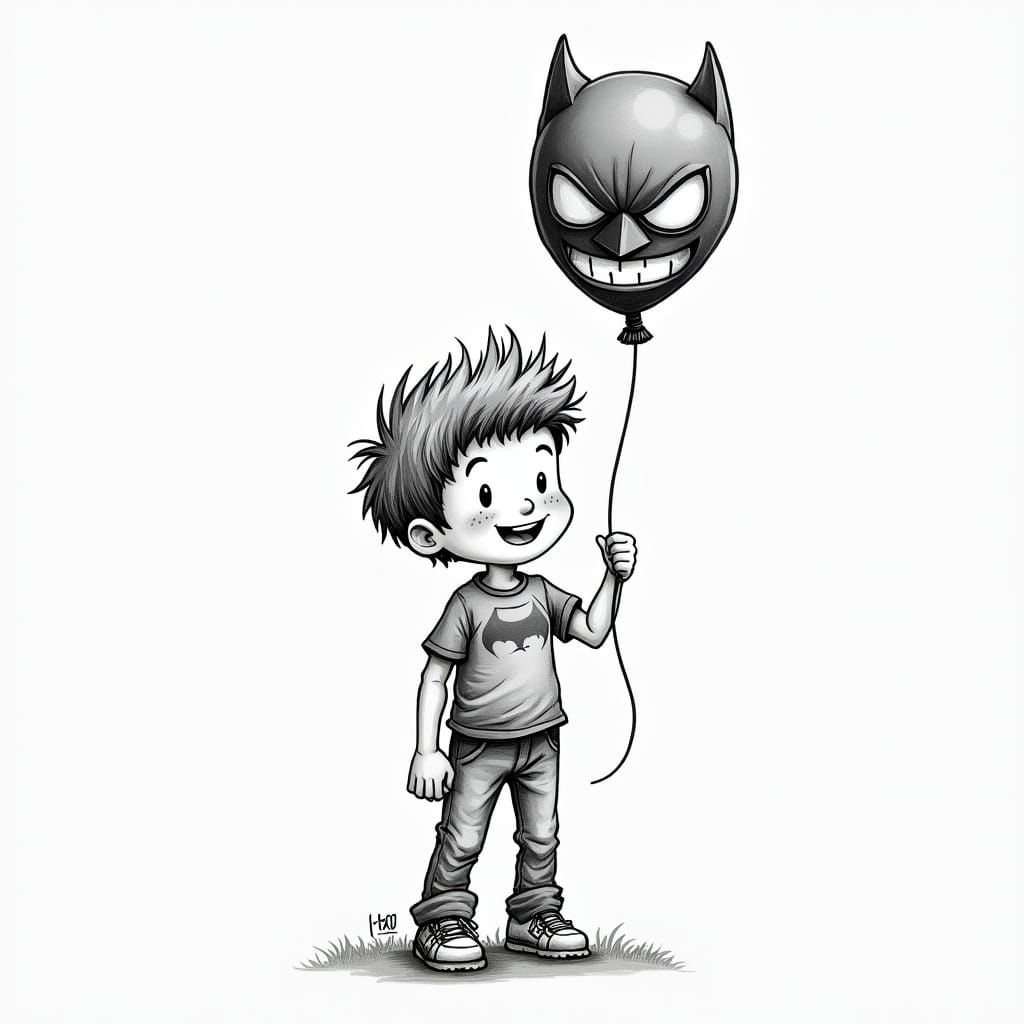 A heartwarming pencil illustration of a 10-year-old boy's birthday joy, captured with a Batman balloon in hand, radiating childhood wonder and excitement.