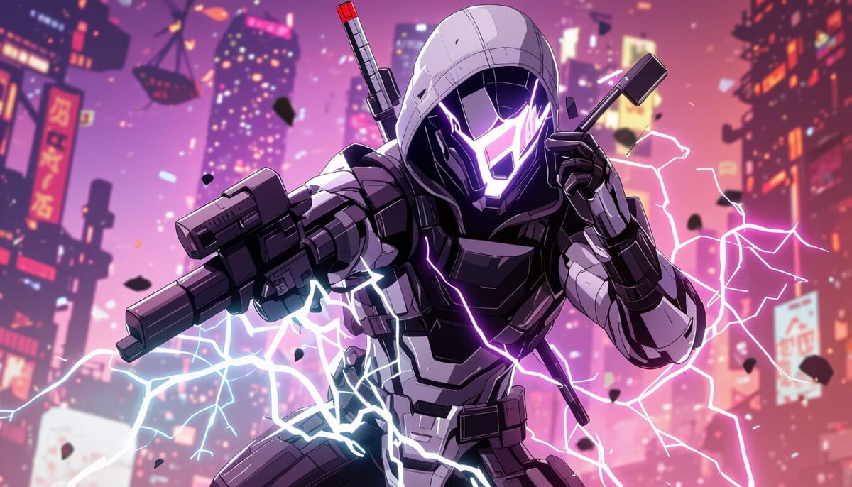 This image shows a hunter battling in a futuristic war-torn city. The sleek, high-tech armor and electric superpowers are rendered with vibrant, high-definition visuals in an anime style.
