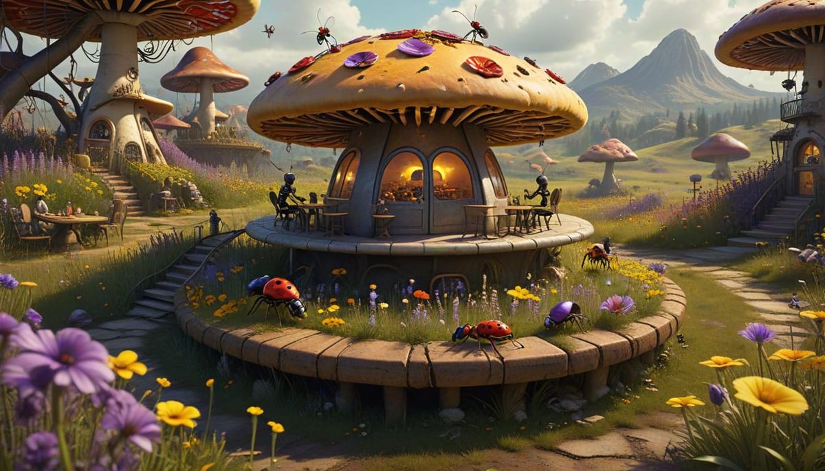 A whimsical steampunk pizzeria scene inside a mushroom. Two ants craft pizza as insect patrons dine outside amongst tall grass and colorful flowers. Ladybugs fly toward the darkly elegant restaurant.
