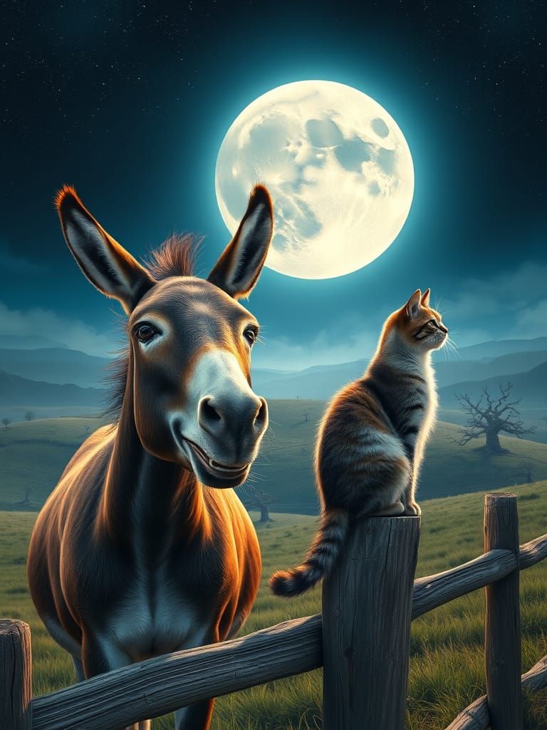 A smiling donkey and a curious cat sit on a wooden fence under a colossal, glowing full moon. The scene features iridescent neon light effects and sharp detail in an alcohol ink art style.