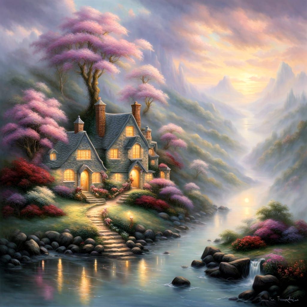 This image shows an ethereal fantasy scene, exhibiting hyperdetailed elements within a misty atmosphere. The composition evokes a sense of emotional harmony.