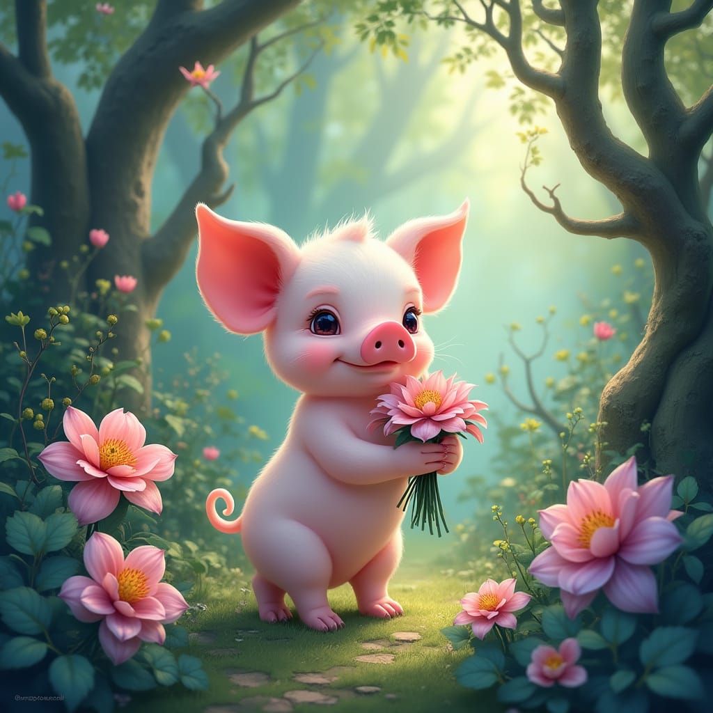 This enchanting image transports viewers to a fantastical world of wonder, featuring a charming piglet amidst a lush, vibrant garden with intricate patterns and delicate flowers in soft pastel hues, evoking the essence of mystical landscapes and dreamlike atmospheres.
