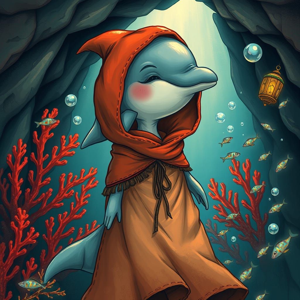 This enchanting underwater scene shows a dolphin in a tattered cloak wandering through a vibrant red coral cave, surrounded by shimmering bubbles and schools of iridescent fish.