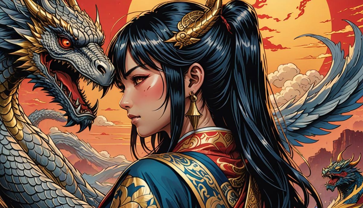 This image shows a medium shot of a beautiful Japanese woman with a dragon tattoo. The comic book art features vibrant ink details, dynamic shading, and soft, gradient colors in a golden hour light.