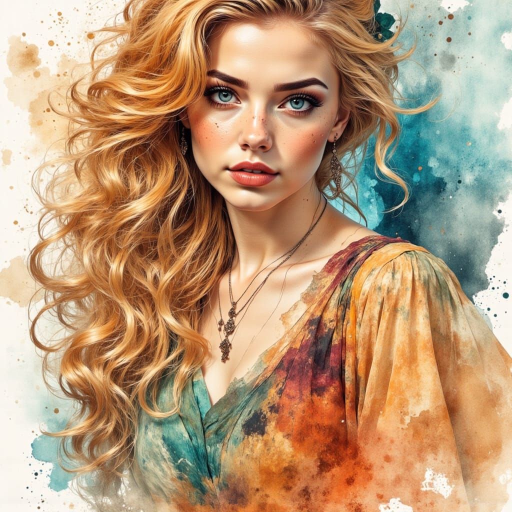 A beautiful, curvy woman with blonde hair is depicted in a stunning watercolour woodcut style, with textures and colours blending together in a captivating composition.