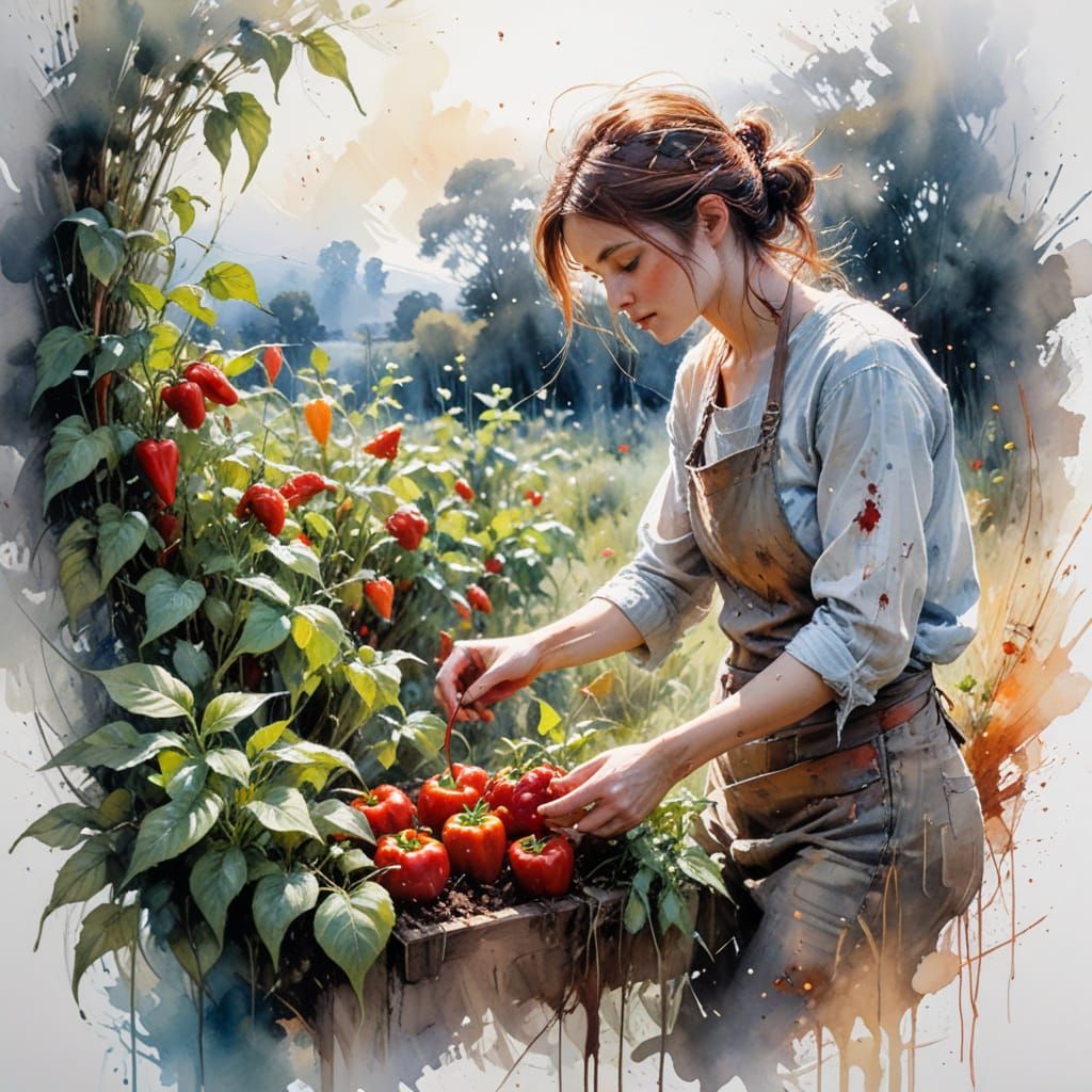 This image shows a farmer harvesting red bell peppers in a sunny vegetable garden. The art style combines watercolor techniques with cinematic stylization, emphasizing the connection between nature and human labor.