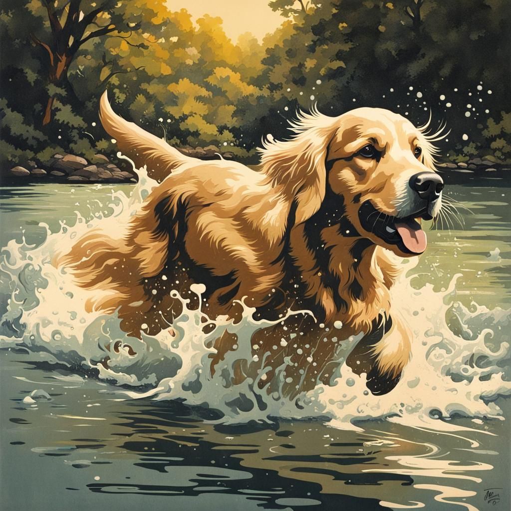 This image shows a golden retriever dog joyfully splashing in a river. The artwork is reminiscent of a vintage poster screenprint and a gouache painting.